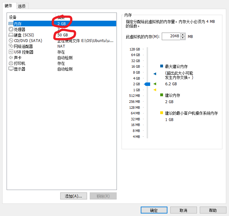把内存和硬盘调小一点,原本是4GB(主机电脑是8GB),现在改为2GB,硬盘没有修改,要是设置的太大可以改小点。点击“确定”保存。