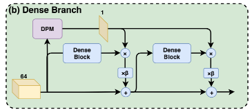 如上图所示,该模型中的dense分支新增了一个方向感知模块(DPM),用于找到摩尔纹的方向。DPM的输出和每一个dense的输出相乘,然后乘以一个因子β然后与输入相加。该设计可以有效的定位摩尔纹的位置。