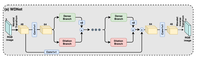 首先RGB图片需要通过WaveletTransform模块进行转换,得到一个48通道的数据,通过WDNet网络同样得到一个通道数与尺寸不变的特征图。最后在一次通过WaveletTransform使用转置卷积将图片还原得到最终预测结果。
