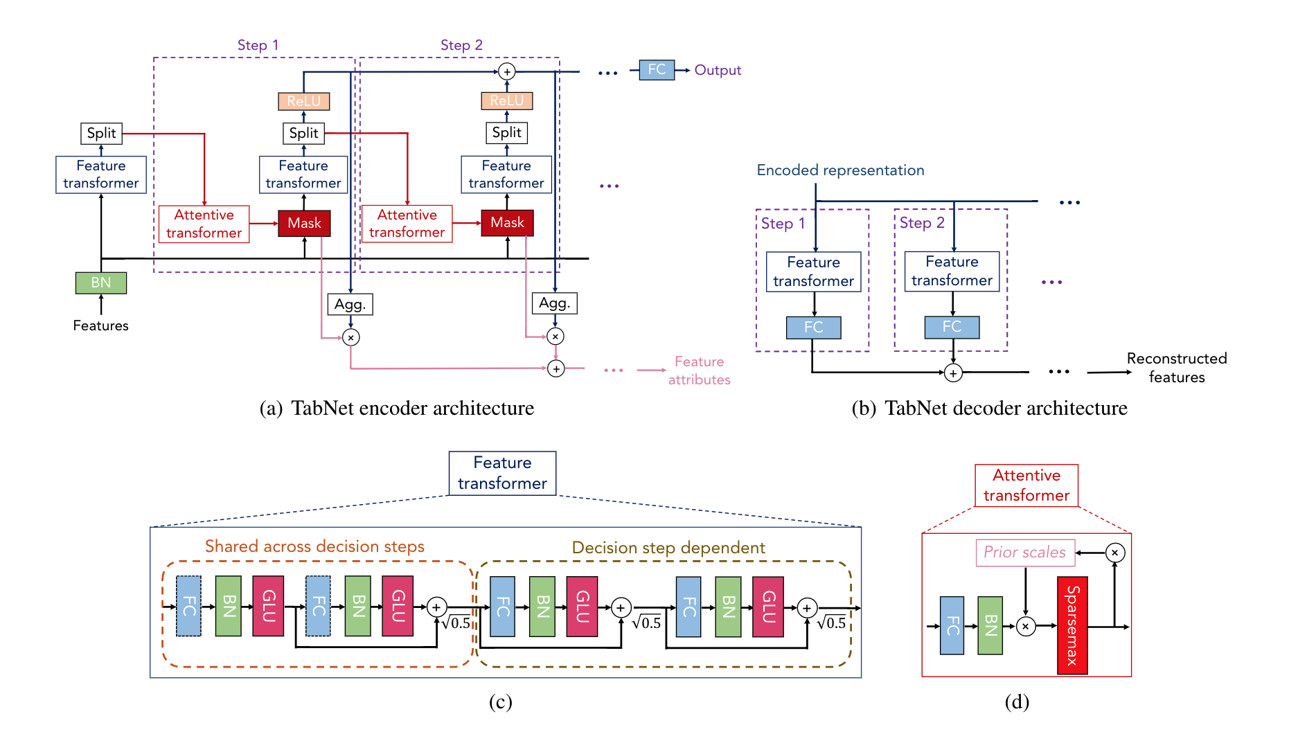b部分为TabNet解码器,每一步由一个特征转换块组成。