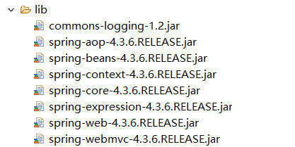 - 首先打开eclipse创建一个Web项目,然后将SpringMVC相关JAR包添加到项目的lib目录下,并发布到类路径中。添加JAR包后的lib目录。