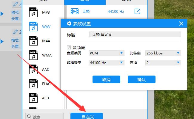设置输出格式为wav格式,如果对音频的音质有所要求,则可以点击“自定义”按钮进行设置,如图所示。