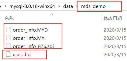 我们找到mysql存放数据的data目录,存在一个mds_demo的文件夹,同时我们也找到了order_info和user的文件。