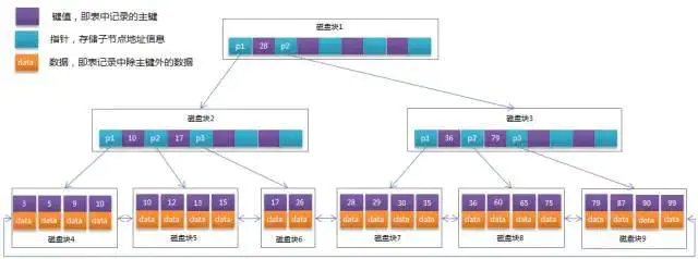 2、 所有叶子节点之间都有一个链指针。对于区间查询时,不需要再从根节点开始,可直接定位到数据。