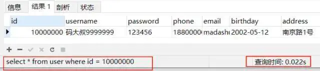 既然题目是《从千万级数据查询来聊一聊索引结构和数据库原理》,首先就来构造一个千万级的表直观感受下。我们创建了一张user表,然后插入了1000万条数据,查询一下: