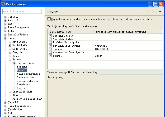 如图,在右面把Combined Hover勾选上(默认),在编辑页面当鼠标放到类或方法上,可显示类或方法的提示,取消打勾可取消类或方法的提示。