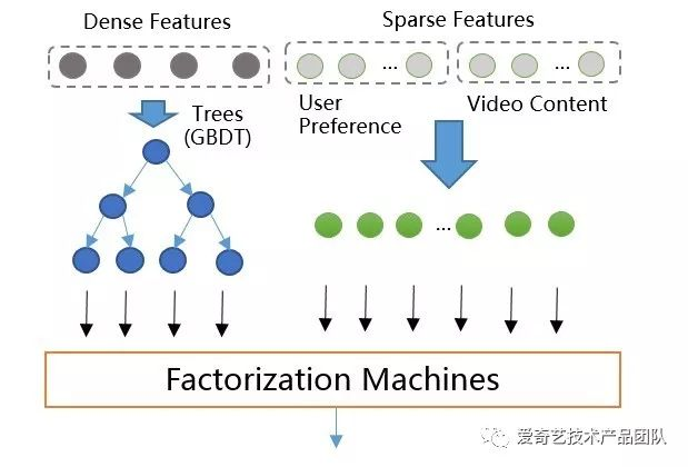 GBDT是不支持高维稀疏特征的,如果将高维特征加到LR中,一方面需要人工组合高维特征,另一方面模型维度和计算复杂度会是O(N^2)级别的增长。所以设计了GBDT+FM的模型如图所示,采用Factorization Machines模型替换LR。