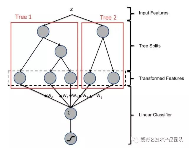 为了解决LR存在的上述问题,我们把模型升级为Facebook的GBDT+LR模型,模型结构如图所示。