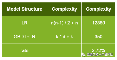 假设特征个数n=160决策数个数k=50,树的深度d=6,两代模型的预测复杂度对比如下,升级之后模型复杂度降低到原来的2.72%