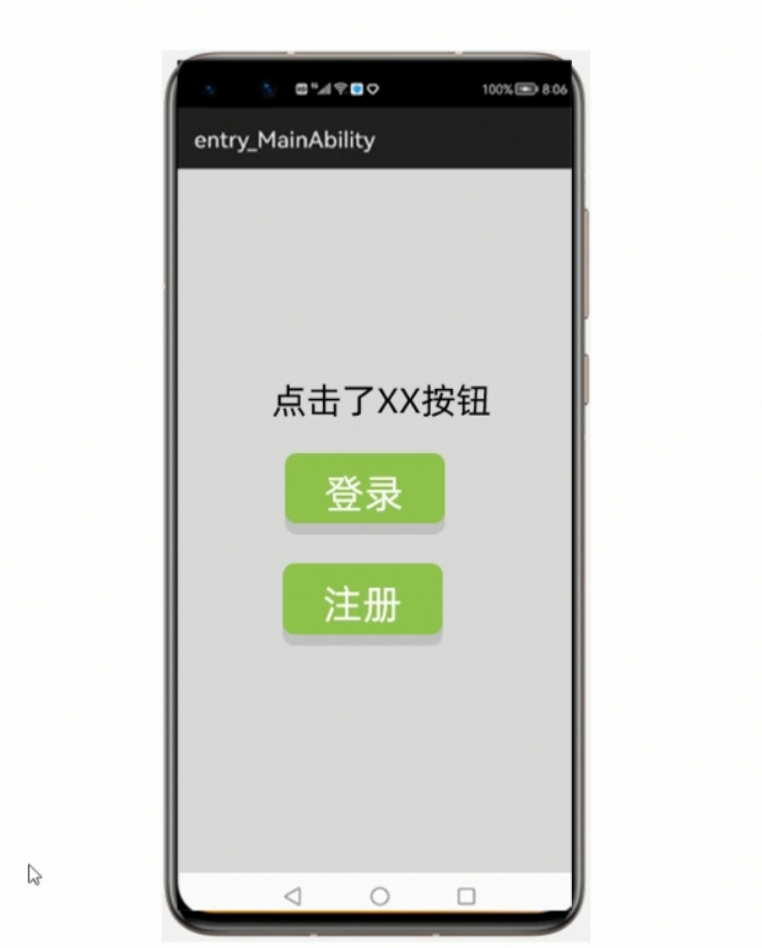 import ohos.multimodalinput.event.TouchEvent;public class MainAbilitySlice extends AbilitySlice implements Component.ClickedListener {Text text1;Button login;Button register;@Overridepublic void onStart(Intent intent) {super.onStart(intent);super.setUIContent(ResourceTable.Layout_ability_main);//1. 找到文本框和按钮组件text1 = (Text) findComponentById(ResourceTable.Id_text1);login = (Button) findComponentById(ResourceTable.Id_login);register = (Button) findComponentById(ResourceTable.Id_register);//2. 给按钮绑定事件//要对登录,注册按钮做点击事件login.setClickedListener(this);register.setClickedListener(this);}@Overridepublic void onActive() {super.onActive();}@Overridepublic void onForeground(Intent intent) {super.onForeground(intent);}@Overridepublic void onClick(Component component) {//现在需要判断当前的按钮是登录按钮还是注册按钮if(component == login){ //表示点击了登录按钮text1.setText("点击了登录按钮");}else if (component == register){text1.setText("点击了注册按钮");}}