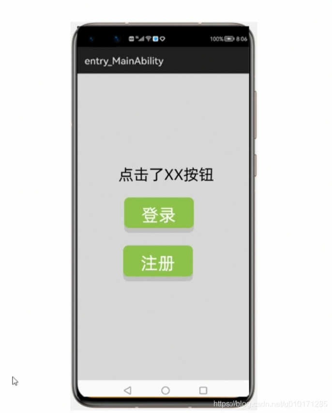 <DirectionalLayoutxmlns:ohos="http://schemas.huawei.com/res/ohos"ohos:height="match_parent"ohos:width="match_parent"ohos:alignment="center"ohos:orientation="vertical"><Textohos:id="$+id:text1"ohos:height="match_content"ohos:width="match_content"ohos:text="Text"ohos:text_size="100"/><Buttonohos:id="$+id:register"ohos:height="match_content"ohos:width="match_content"ohos:text="注册"ohos:text_size="100"ohos:background_element="red"/></DirectionalLayout>