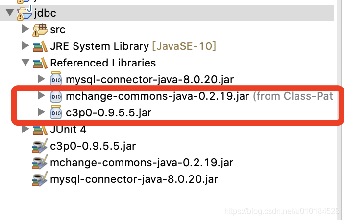 - 在项目中添加C3P0连接池依赖,这两个包都要导入,不然会报错